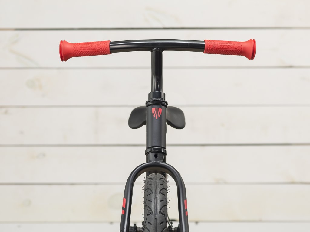Kickster má lehký hliníkový rám a velmi jednoduchou geometrii stepthrough ideálně navrženou pro krátké nohy. Je osazeno 12palcovými koly, rukojetí na sedle, abyste své ratolesti mohli trochu pomoct, a omezovačem řídítek, takže děti nemohou úplně protočit či příliš rychle otočit přední kolo.